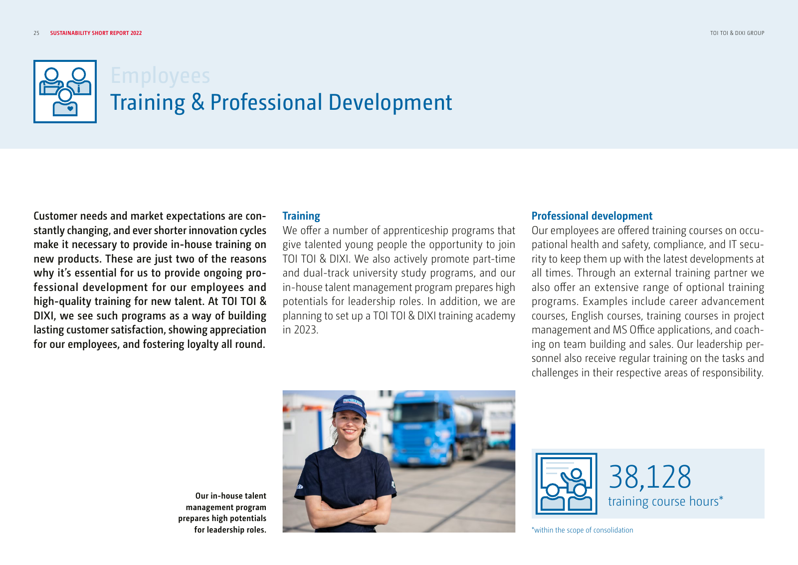 Customer needs and market expectations are con stantly changing and ever shorter innovation cycles make it necessary to provide in house training on new products These are just two of the reasons why it s essential for us to provide ongoing pro fessional development for our employees and high quality training for new talent At TOI TOI DIXI we see such programs as a way of building lasting customer satisfaction showing appreciation for our employees and fostering loyalty all round Training We offer a number of apprenticeship programs that give talented young people the opportunity to join TOI TOI DIXI We also actively promote part time and dual track university study programs and our in house talent management program prepares high potentials for leadership roles In addition we are planning to set up a TOI TOI DIXI training academy in 2023 Employees Training Professional Development Professional development Our employees are offered training courses on occu pational health and safety compliance and IT secu rity to keep them up with the latest developments at all times Through an external training partner we also offer an extensive range of optional training programs Examples include career advancement courses English courses training courses in project management and MS Office applications and coach ing on team building and sales Our leadership per sonnel also receive regular training on the tasks and challenges in their respective areas of responsibility Our in house talent management program prepares high potentials for leadership roles 38 128 training course hours within the scope of consolidation 25 SUSTAINABILITY SHORT REPORT 2022 TOI TOI DIXI GROUP